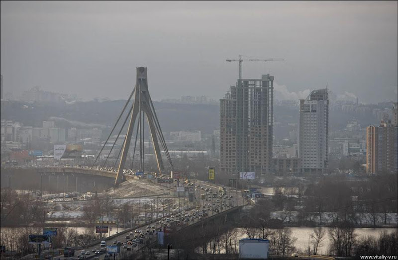 The bridge was opened for use in 1976 and still plays a crucial role in the life of the city and its infrastructure. It comprises three parts: cable bridges cross Dnepr as long as 816m (2677 feet), bridge across Desyonka river 732m (2400 feet) in length and a crossover 55m or 180 feet in length. In an exposure draft it had supposed to have 3 lanes in every direction, but some time after the draft was reconsidered and the bridge was built with 4 lanes in every direction. In the end of 80’s there was a trackless line laid there.